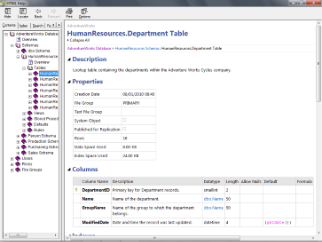 Overview of the database, listing Schemas, Tables, Views, Stored Procedures, Functions, Data Types, Users, Roles, FileGroups etc.