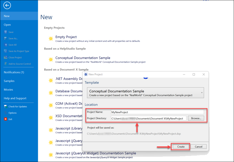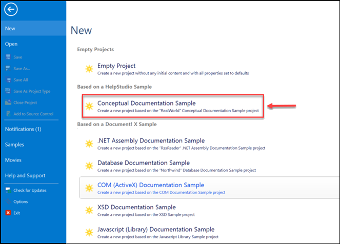 3. In the New Project Wizard, select Conceptual Documentation Sample option from the HelpStudio sample. You will see a pop-up window appears for project creation.