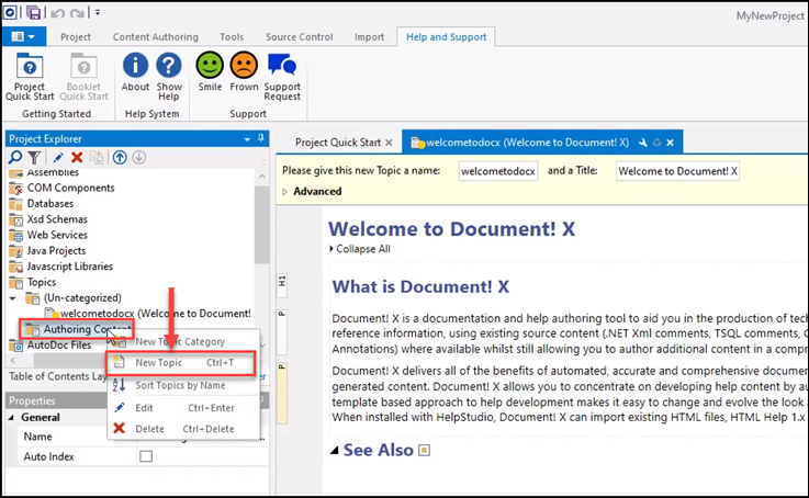 - To add a topic to the Authoring Content, simply right-click on Authoring Content and then select New Topic from the context menu that appears.