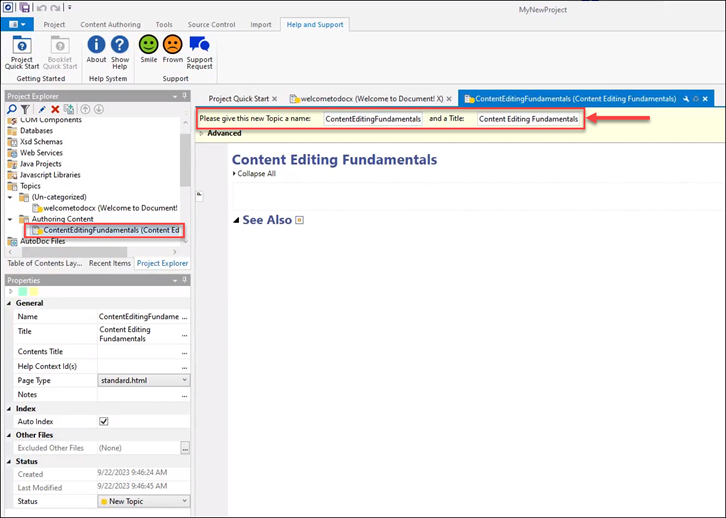 - Name the new topic as Content Editing Fundamentals in both the name and title spaces.