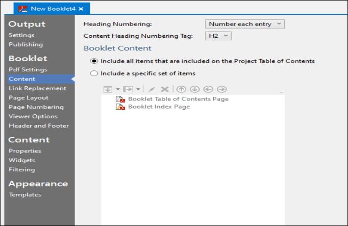 The next step involves adding topics to a booklet using the Content option. Here, you determine the content to include in the booklet. The default settings in the Content option is to include all items listed on the project table of contents. This option includes everything already present in your project's table of contents, maintaining the existing structure. However, if you want to include only specific items in the booklet, you will need to select the alternative option include a specific set of items. This feature is particularly useful for creating multiple booklets, rather than replicating the overall project structure. It is an ideal approach for creating getting started guides or tutorials. To learn more about these two options, check Booklet Fundamentals.