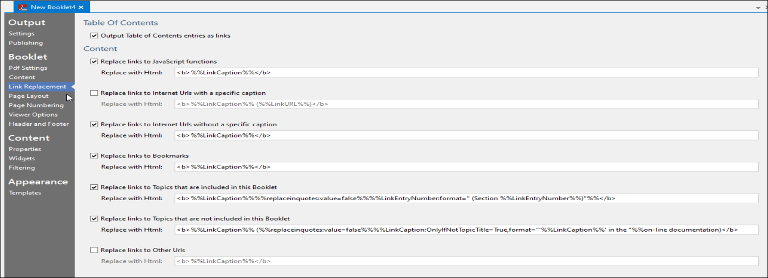 - By default, most links in the generated PDF are automatically converted to readable text. All you need to do is just make sure that all the relevant options are selected in the Link Replacement menu.