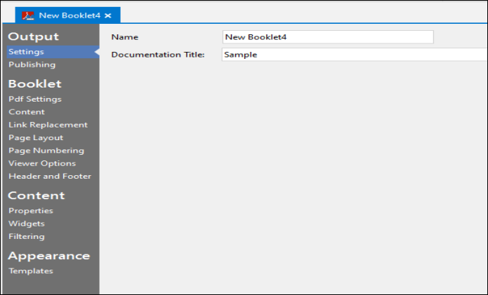 This action triggers the creation of a new booklet and opens the booklet Settings for editing. Here, you can customize settings according to your project preferences. - Enter the name you want for your project in the Name field and the title for your documentation in the Documentation Title field.