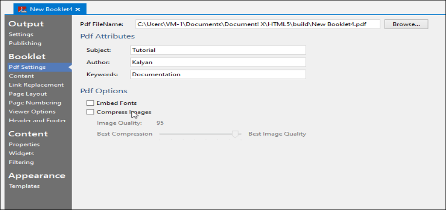 - Select Pdf settings option. Here, you can configure the document properties such as subject, author and keywords.