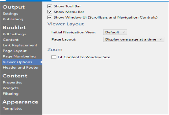 - In the Viewer Options, you have the options to define the default viewer options in the PDF such as toolbar, menu bar, and windows UI. Here are your choices:
