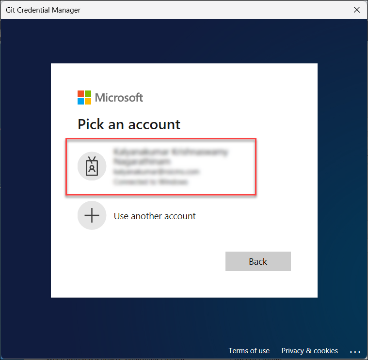 The application prompts you to select the account related to the URL you access. - In the Get Credential Manager dialog, select your account.