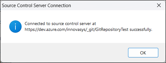 A successful connection to the source control server displays a success message. - Select OK to close.