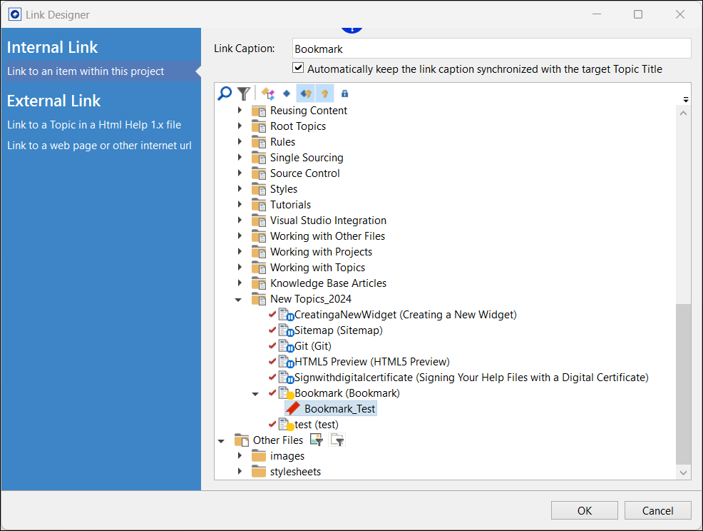 3. In the Link Designer dialog, select the topic containing the bookmark.