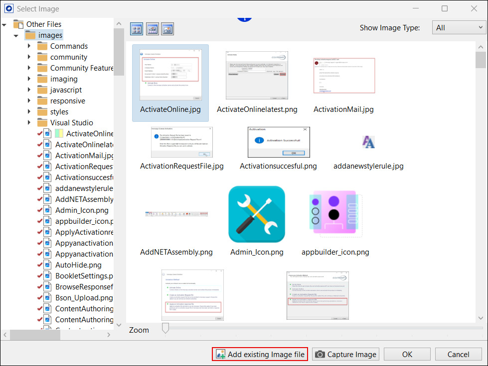 You can use the Capture Image option to take a screenshot of your screen and include the image file in your project without inserting it into topics or content snippets.- Go to Content Authoring tab, select Image.