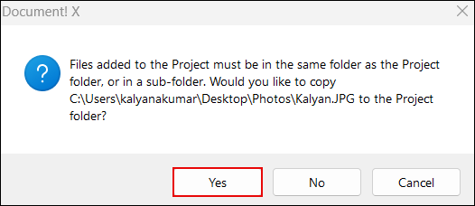 The images added to the project must be in the same local folder as the project folder or in a sub-folder. A prompt message appears if the images are not in the same local folder as the project folder. - Select Yes.