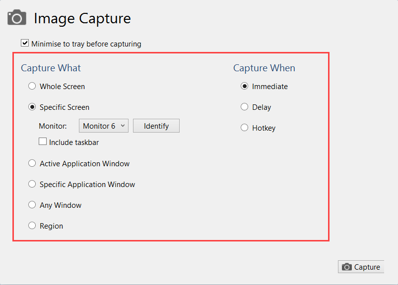The Image Capture dialog offers Capture When and Capture What options, enabling you to select when the capture occurs (immediately, after a specified delay, or via a defined hotkey) and what the target of the capture is (whole screen, a specific screen, active application window, specific application window, any window, and region).After capturing an image, a preview and options appear to save, save and edit, save and markup, save and insert, save and insert thumbnail, and discard and recapture.