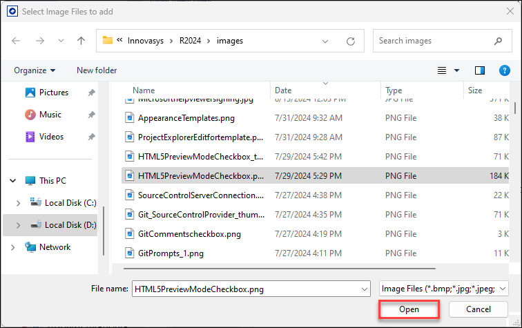 - On the Select Images files to add dialog, select the image you want to add from the local folder, and select Open.