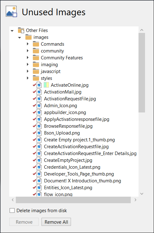 The find unused images tool in the HelpStudio Suite searches your project for images that are not currently included in your project's content. You can then choose to remove these images from your project if you are sure that they are not required.