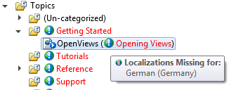 When you switch to another locale, the Project Explorer and Table of Contents Editor display titles in that locale. Any new editors or project tools you open will also open in that locale. The Properties window shows localizable properties in the current locale.