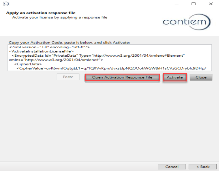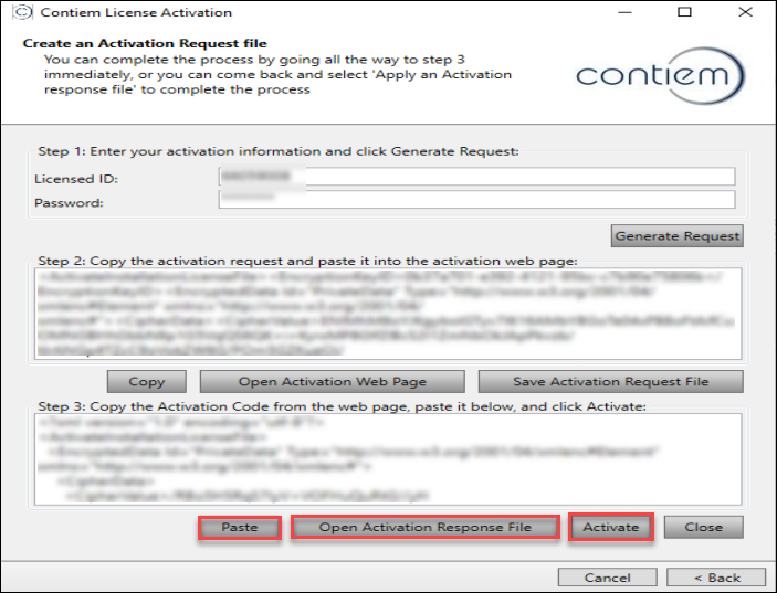 - On the Create an Activation Request file dialog, select Paste to paste the copied response code into the text box and select Activate, or select Open Activation Response File to upload the response file and select Activate.