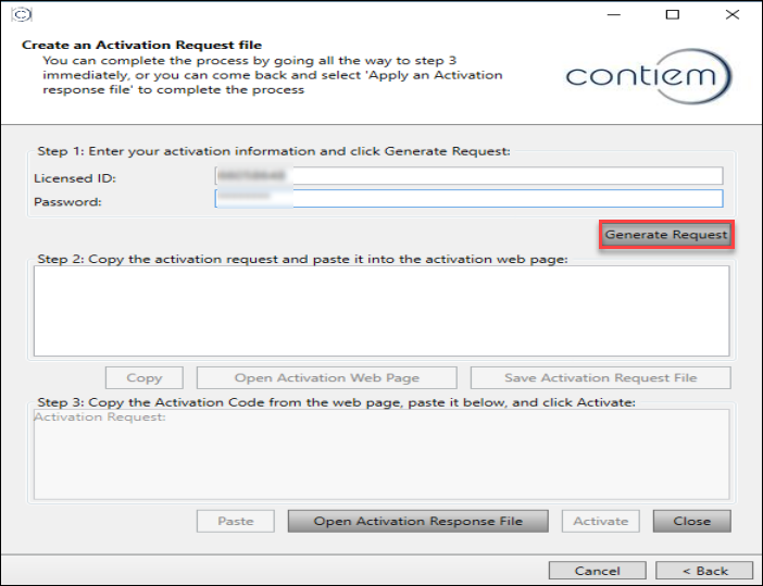 - On the Create an Activation Request file dialog, enter the License ID and Password details and select Generate Request.