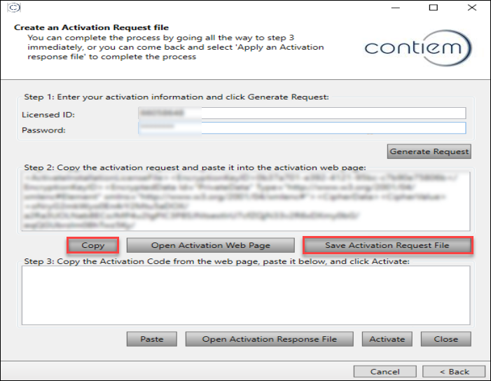 - Select Copy to copy the activation request code or Save Activation Request File to save the activation request file.