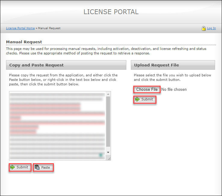 Go to a machine where you have internet access, and navigate to the License Portal Manual Request page (https://secure.softwarekey.com/solo/customers/ManualRequest.aspx). - Select Paste to paste the copied activation request code into the text box and select Submit, or Select Choose File to upload the activation request file and select Submit.
