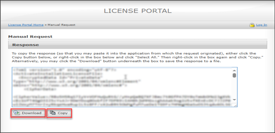 - On the License Portal Manual Request Response page, select Copy to copy the response code or Download to download the Response file.