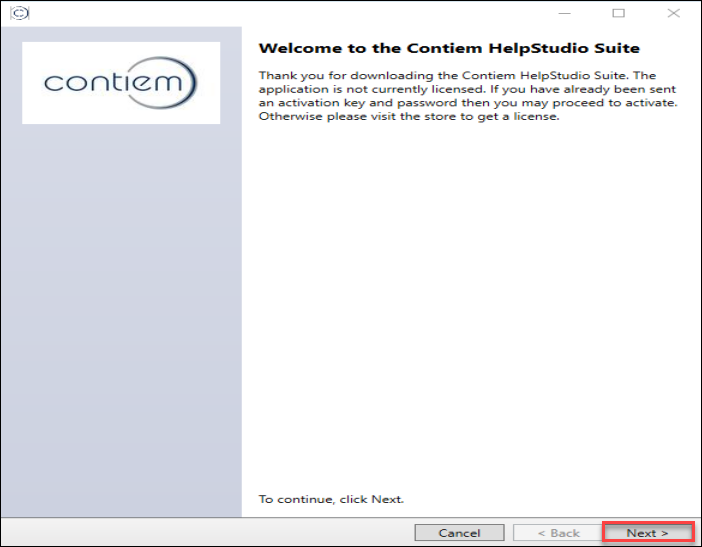 - On the Welcome to the Contiem HelpStudio Suite dialog, select Next.