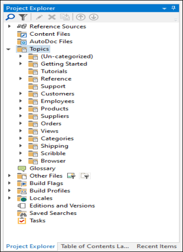 The Project Explorer provides an organized view of all the items that make up your project, including topics, images, stylesheets, and other resources.